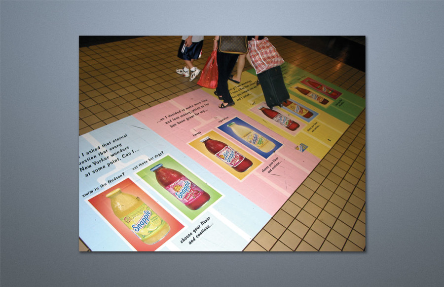 Snapple "Station Domination": Campaign for Snapple Beverages consisting of adhesive floor graphics, two and three sheet posters and hanging banners was installed in New York's Port Authority Terminal. Utilizing silk screen printing and digital technology, diverse graphic elements were produced to exacting standards and schedules.